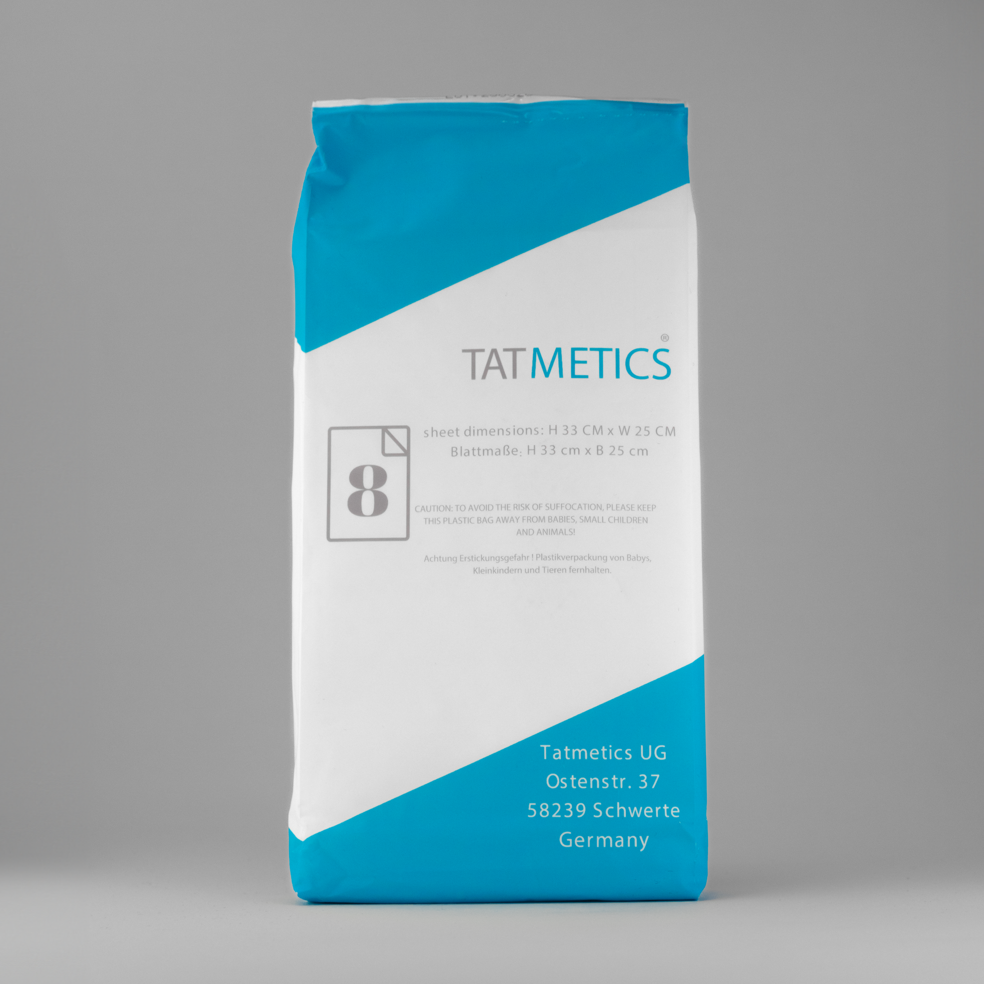 Tatmetics® Tattoopads wurden entwickelt um Tattoos nach der Tätowierung zu schützen und überschüssige Farbe zu absorbieren. Die Pads werden mittels hautverträglichem Tape oder Pflaster befestigt und schützen Tattoos vor Sonne sowie Umwelteinflüssen wie Staub oder Haaren. In der akuten Phase nach der Tätowierung sollte das Pad alle 4 bis 6 Stunden gewechselt werden. Unsere Kunden berichten von einem erleichterten Pflegeprozess und deutlich angenehmerem Tragekomfort gegenüber der klassischen Frischhaktefolie. Vorbei sind die Zeiten feuchter, kitschiger und unhygienischer Folie unter welcher sich permanent Wärme staut. Die Pads sorgen für eine schnelle Trockenlegung des tätowierten Areals, was eine Krustenbildung bei regelmäßigem Wechsel quasi unmöglich macht.